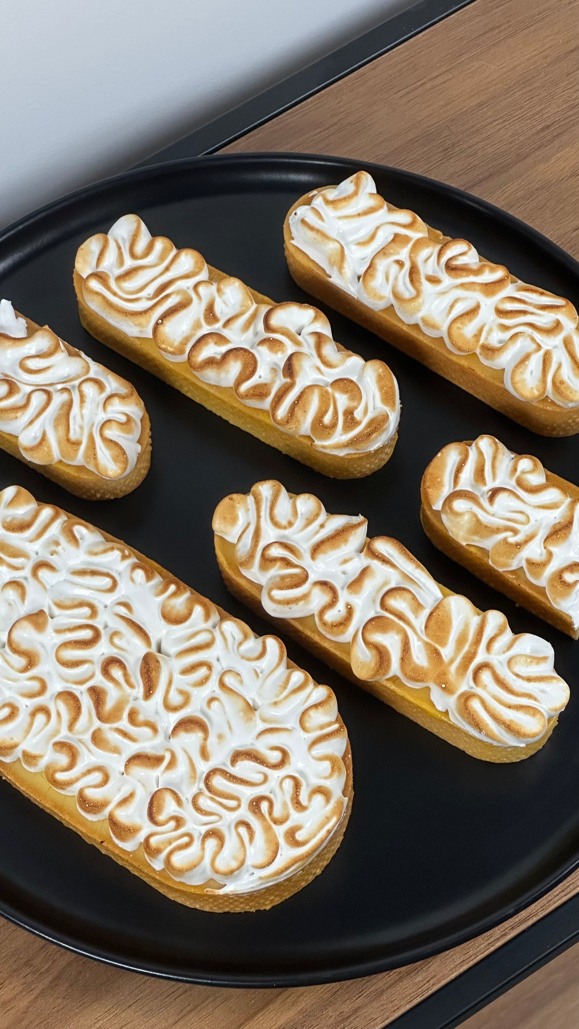 Une pâte sucrée croquante, un coulis citron vif, une crème infusée aux zestes de citron jaune et vert. Le tout est surmonté d’une meringue italienne légère et onctueuse, subtilement brûlée pour une touche caramélisée.